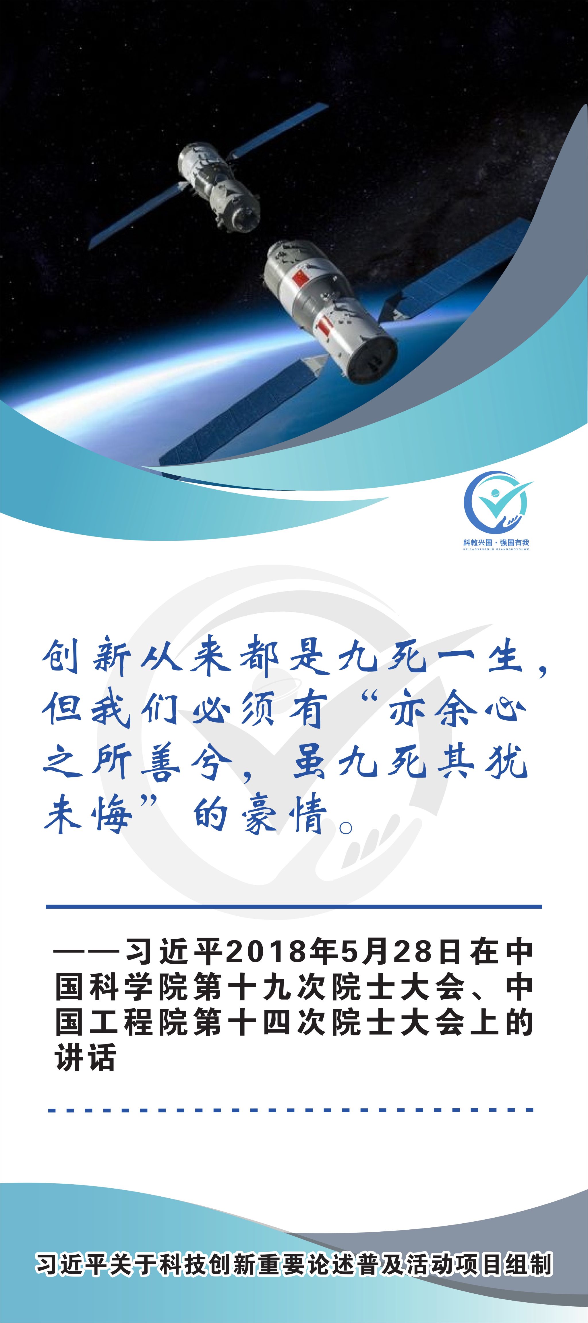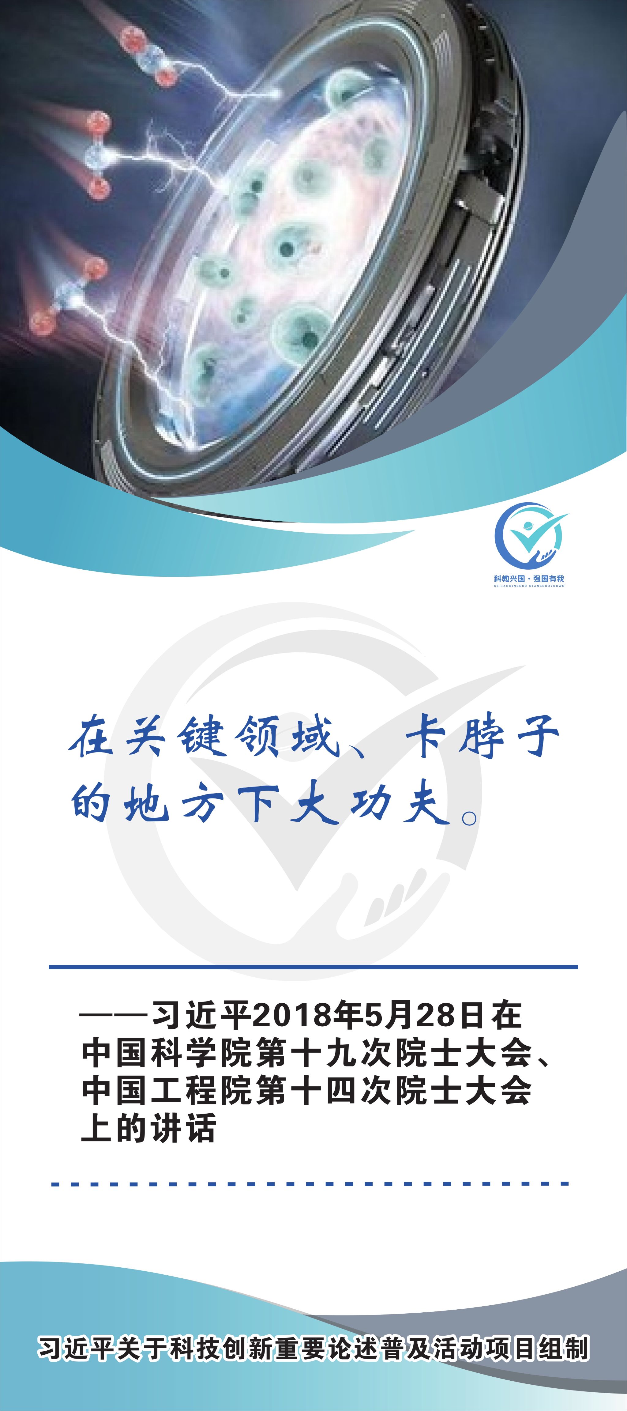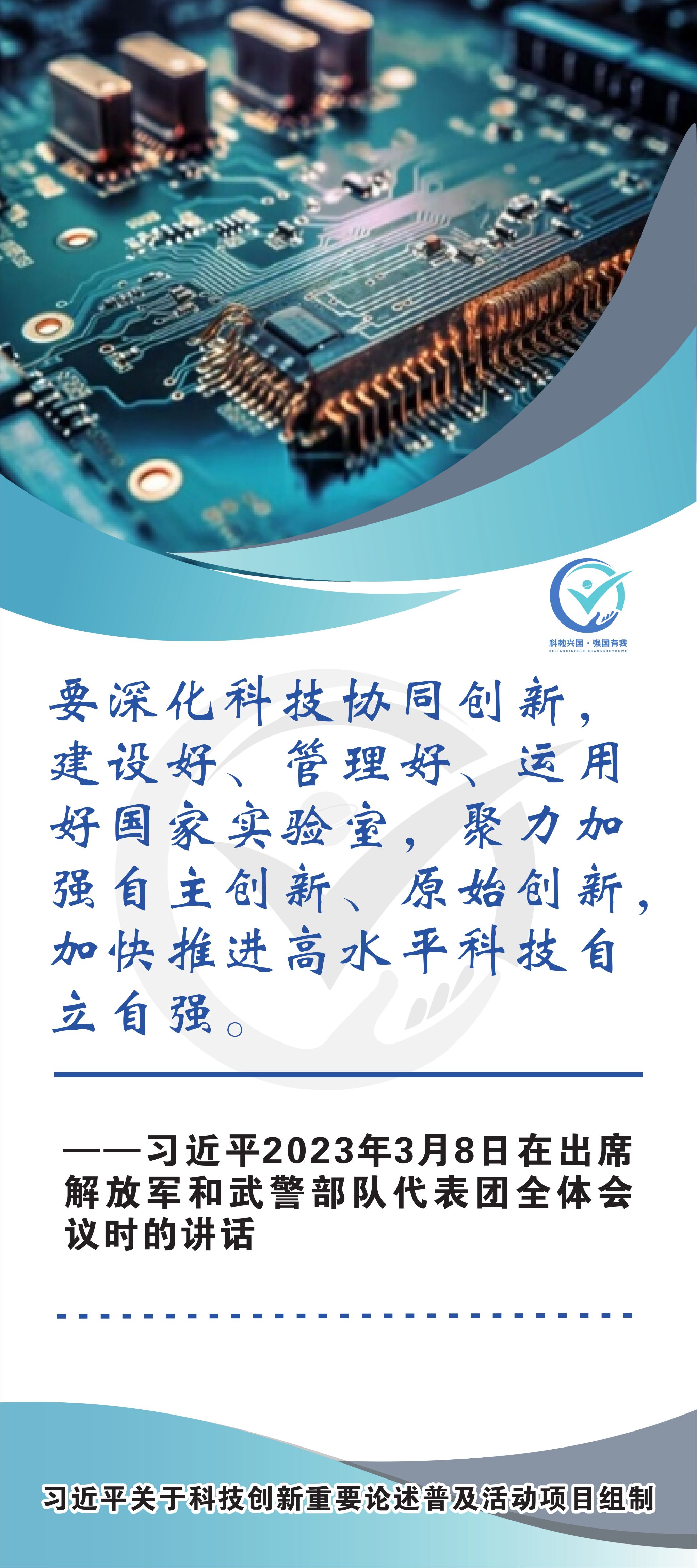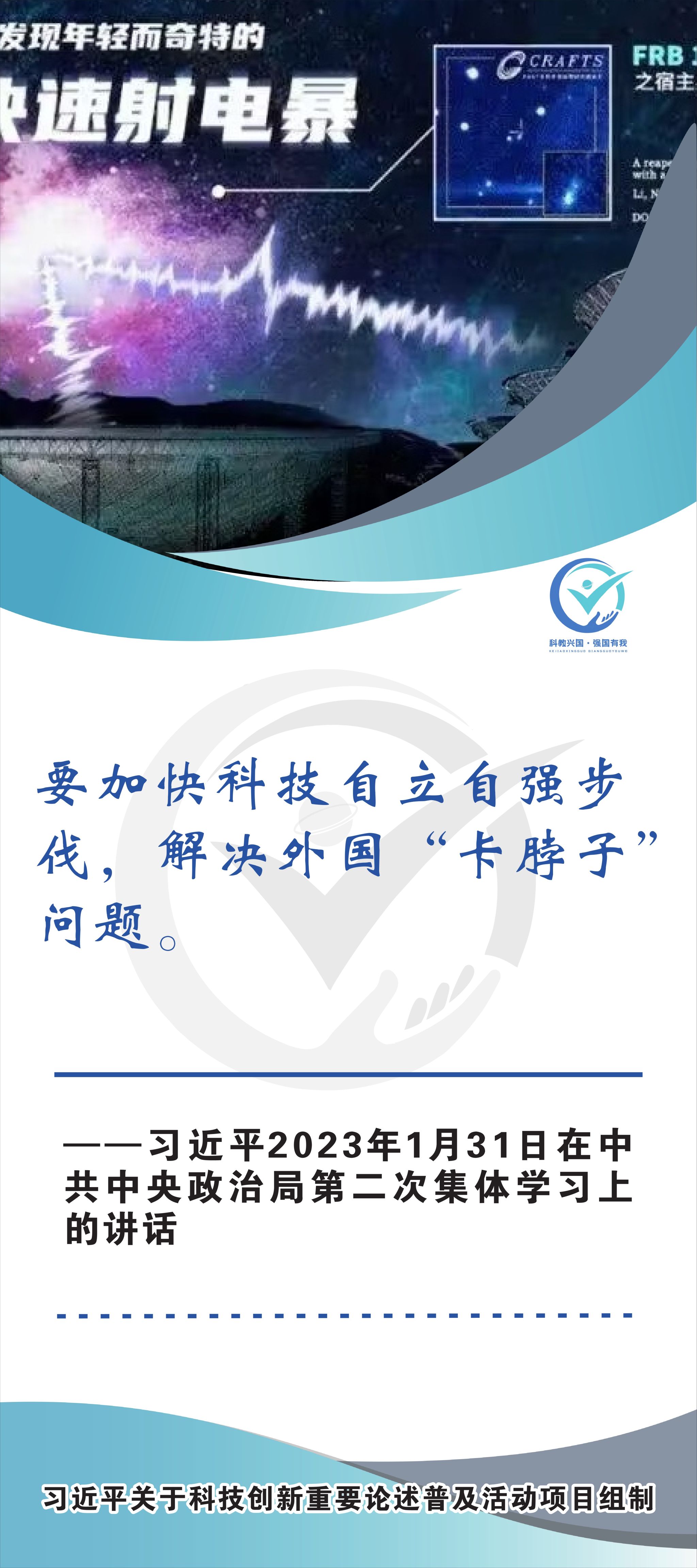 活动现场设立了30张立幅原文海报,设置原著展台,结合多媒体原声播放生动还原习近平总书记对于科技自立自强的重要论述,辅以现场宣讲,在较短时间内让参观者充分掌握本专题的核心要义和思想伟力。采取学习“习语金句”和金句问答等方式,有助于大学生把握重要讲话精髓,也有助于师生共同探索思政和科普相结合的宣教途径。外宣版块通过在学校教学楼出入口醒目位置设立打卡墙,提高昭示性,鼓励自拍互拍上网上群,扩大活动影响力,推动科技创新专题的主题教育走深走广走实,弘扬新时代科学家精神,凝聚创新创造激情和科技报国热情。