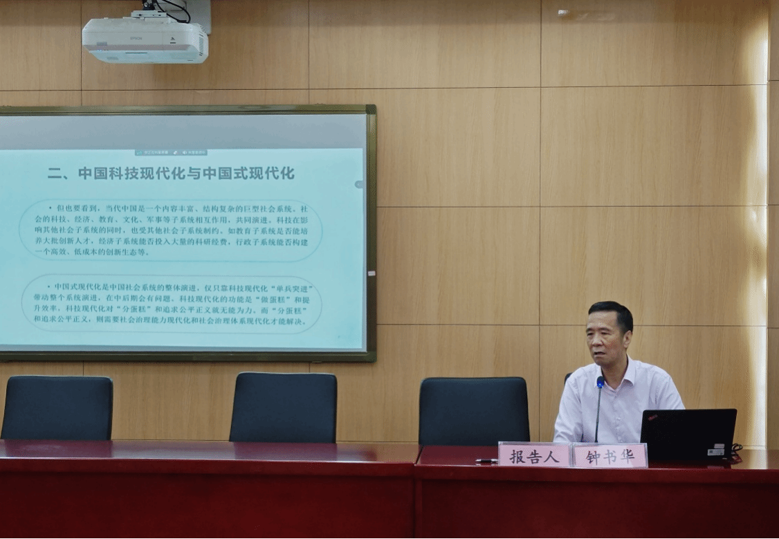 华中科技大学公共管理学院钟书华教授作了题为《中国科技现代化:理论逻辑与实践方向》的报告,从中国科技现代化的四次高潮、中国科技现代化与中国式现代化、中国科技现代化建设的阶段及目标、中国科技现代化应避免“苏联陷阱”和“日本陷阱”、中国科技现代化的推进方向五个方面进行了详细讲述。中国人民大学哲学院王伯鲁教授作了题为《科技创新中的五对矛盾》的报告,指出科技创新过程中存在确定性与不确定性的对立、理性逻辑与非理性非逻辑的协同、规划性与主动性的矛盾、利益与危害的冲突、创新中的严与宽的五对矛盾,提出要通过司法解释的适度宽松和加快修法、立法进程来灵活处理解决矛盾。