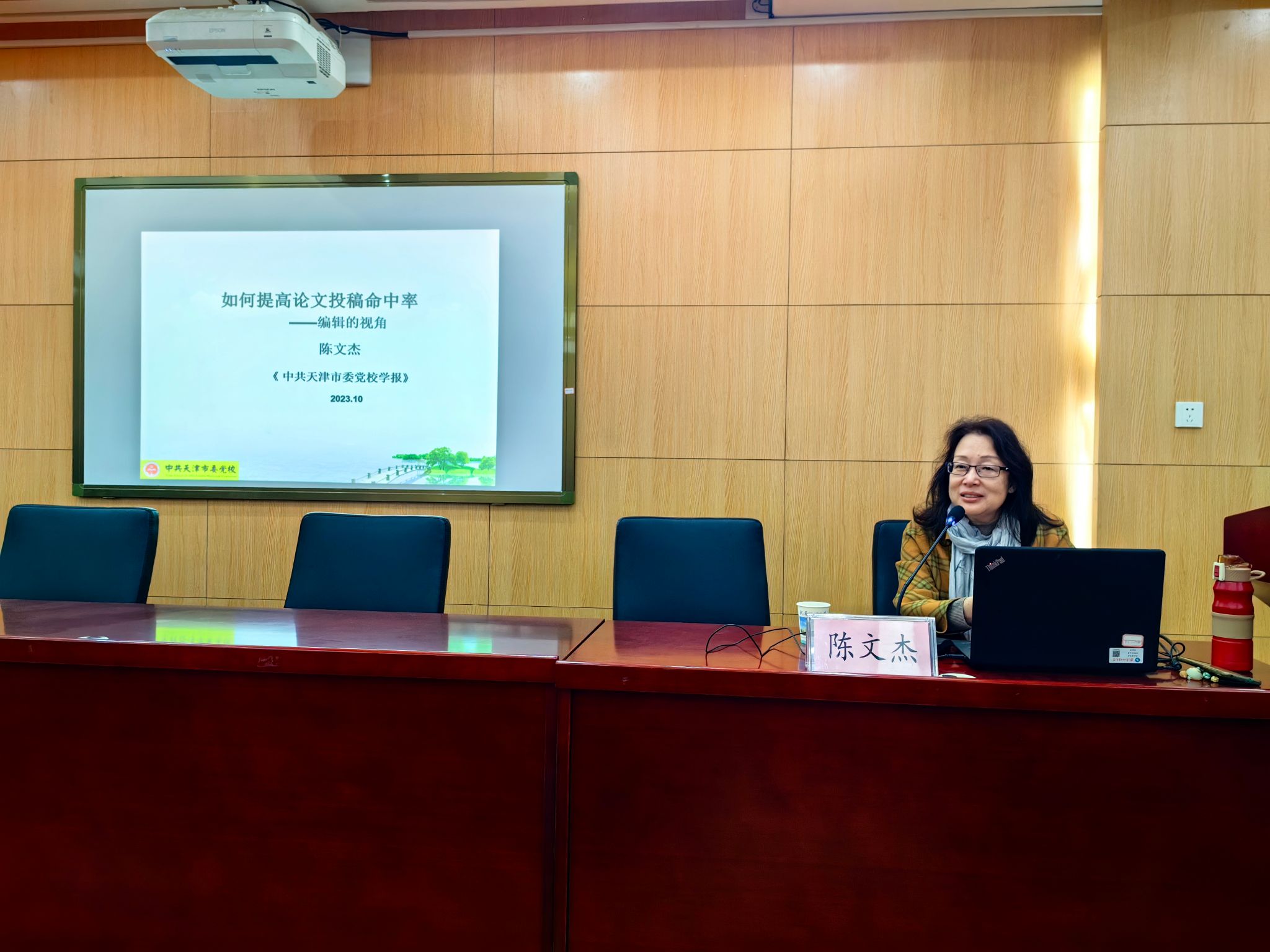 陈文杰结合多年审稿经验和编辑经验,分享编辑审稿的价值判断与价值选择,为我院师生论文写作及其投稿做出指导性建议。她主要从“学术论文的创新点”、“完善论文结构”、“了解目标期刊要求”、“投稿小技巧”四个方面进行讲学。通过讲述论文标题优化技巧,分析当前投稿论文标题中存在的问题,她强调学术论文的标题要具有学理性、逻辑性、层次性,也要紧密联系社会现实以及学术前沿。同时,陈文杰从学术期刊及编辑的角度,详细介绍了《中共天津市委党校学报》的审稿周期,审稿标准以及审稿结论,以此鼓励全体师生积极参与投稿。