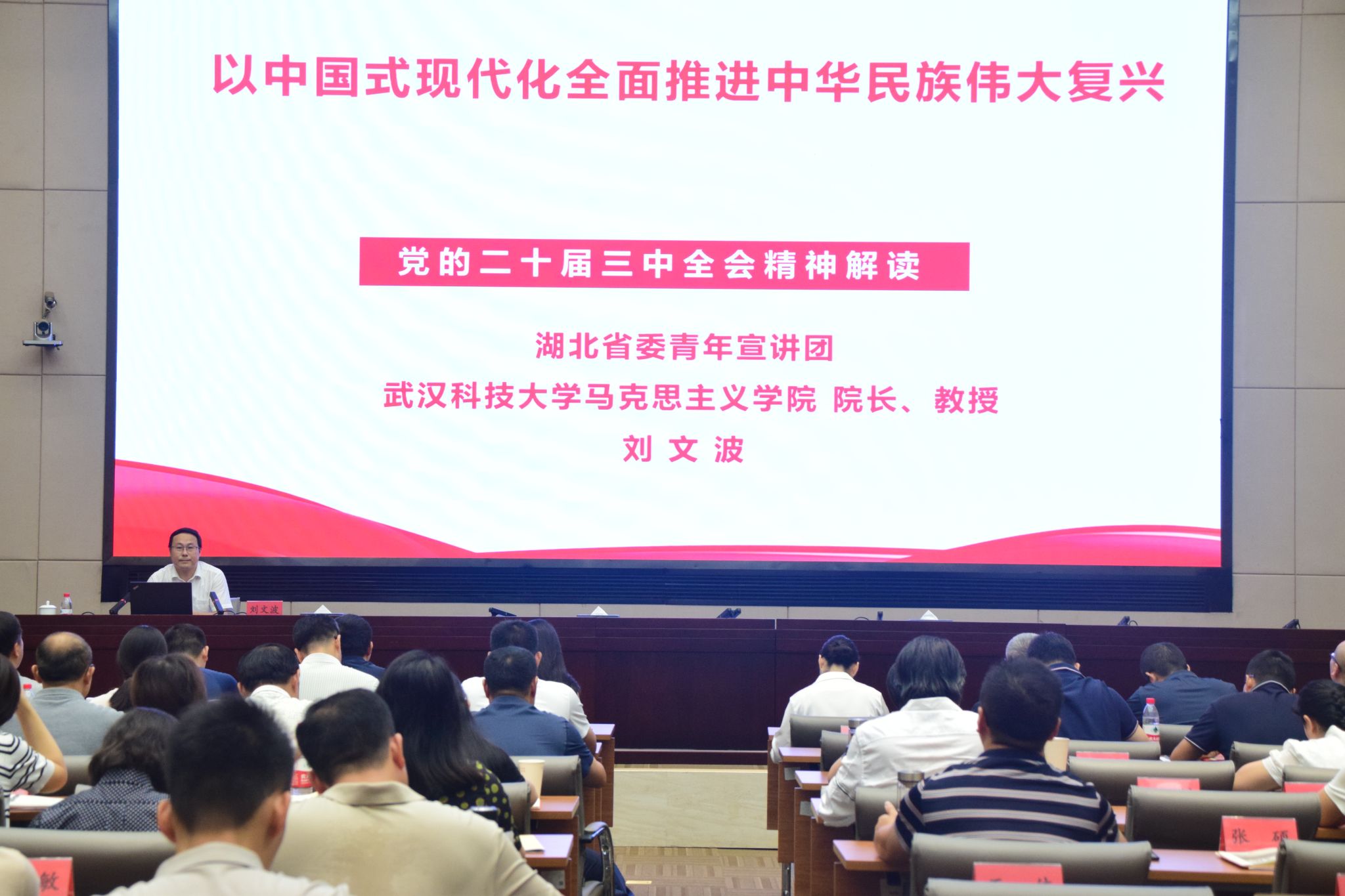 9月9日上午,新疆博州组工干部能力素质提升培训班、湖北省委党校“弘扬大别山精神 树立正确政绩观”专题培训班在中共湖北省委党校(湖北行政学院)红安分校(院)举行。省委青年宣讲团成员、舆情研究中心主任、我院院长刘文波教授应邀以《以中国式现代化推进中华民族伟大复兴》为题做二十届三中全会精神的专题辅导报告。省委党校2024年第3期年轻党员干部主体班和新疆博州组工干部班的200多党员干部学员参加了培训。