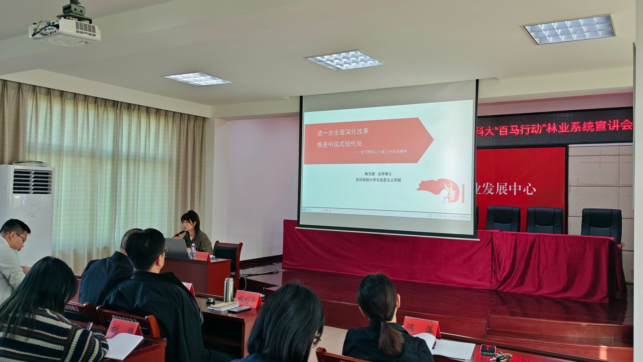 在仙桃市林业事业发展中心,梅玉婕老师以《进一步全面深化改革,推动中国式现代化》为题,对系统把握“进一步全面深化改革”的部署重点进行了深入浅出的宣讲。“作为一名林业基层工作者,深感我们这代林业人正逢其时、重任在肩。将立足自身岗位,守护生态安全,实现从‘绿满’向‘绿美’蝶变。”在市林业事业发展中心,林业系统干部职工齐聚一堂、气氛活跃。主题鲜明的宣讲阐释,引发阵阵共鸣。