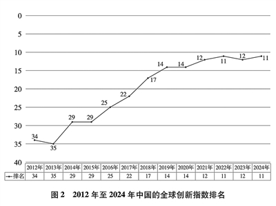 加快实现高水平科技自立自强。发挥新型举国体制优势,在基础原材料、高端芯片、工业软件、农作物种子等关键核心技术上全力攻坚,在人工智能、量子信息等领域前瞻部署,加快攻克重要领域“卡脖子”技术并实现产业化,“祖冲之”系列超导量子计算原型机、“嫦娥六号”探测器、“梦想”号大洋钻探船等纷纷取得突破。加快布局国家战略科技力量,加强基础科学研究,推动国家实验室体系建设,统筹推进国际和区域科技创新中心建设,强化企业技术创新主体地位,提高科技成果转化和产业化水平。中国的全球创新指数排名从2012年的第34位跃升至2024年的第11位,进入创新型国家行列。构建科技安全风险监测预警和应对体系,完善新兴技术领域监管制度,塑造科技向善的文化理念,把科技伦理要求贯穿科技活动全过程。(见图2)