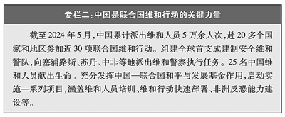 坚定支持联合国提高维和行动履行授权能力。中国是联合国第二大会费国、第二大维和摊款国,也是安理会常任理事国第一大维和行动出兵出警国。支持联合国在国际反恐斗争中发挥中心协调作用,在全球数字治理和规则制定方面发挥主导作用,支持世卫组织在全球卫生事务中发挥领导协调作用,支持联合国教科文组织推动全球教育、科技、文化发展,促进文明交流互鉴、包容合作。(见专栏二)