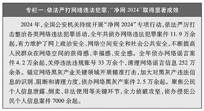 建设平安中国。持续深化严打暴恐专项行动,对“东突”等“三股势力”保持依法严打高压态势,实现反恐斗争形势根本好转。依法打击各类黑恶势力违法犯罪,扫黑除恶常态化走深走实。社会治安持续稳定向好,依法严惩群众反映强烈的黄赌毒、食药环、盗抢骗和针对妇女儿童、留守老人的突出违法犯罪,依法严厉打击电信网络诈骗、跨境赌博、侵犯公民个人信息等新型犯罪和跨国跨境跨区域犯罪,保护人民人身权、财产权、人格权。建立健全维护社会稳定责任制,社会大局保持稳定。坚持和发展新时代“枫桥经验”,加强综治中心规范化建设,推进矛盾纠纷化解法治化。维护社会公平正义,培育自尊自信、理性平和、积极向上的社会心态。中国是世界上命案发案率最低、刑事犯罪率最低、枪爆案件最少的国家之一。据中国公安部数据,2023年中国每十万人命案发生数为0.46起,2024年为0.44起。