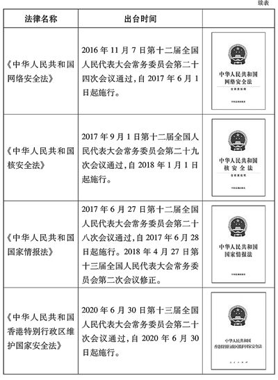 进入新时代,中国全面深化改革,以巨大的政治勇气开启国家安全体系和能力现代化建设进程,通过设立中央国家安全委员会,建立集中统一、高效权威的国家安全领导体制和工作机制;出台以国家安全法为统领的一系列国家安全法律法规,初步形成国家安全法律体系;制定《国家安全战略纲要》、《国家安全战略(2021—2025年)》,出台一系列重点领域国家安全战略和政策,初步形成国家安全战略体系和政策体系;加强风险防范、应急处置,全领域覆盖、多层级运转的风险监测预警体系和大安全大应急框架初具雏形;调整国家安全力量布局,加强重点领域安全能力建设,加强国家安全教育,建立起国家安全体系和能力现代化的四梁八柱,为下一步攻坚克难、不断完善奠定了良好基础。