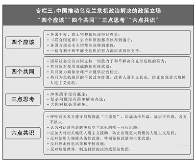 在乌克兰问题上,恪守客观公正,积极劝和促谈,提出“四个应该”、“四个共同”、“三点思考”,发布《关于政治解决乌克兰危机的中国立场》,同巴西联合发布“六点共识”,会同“全球南方”国家发起“和平之友”小组,坚决维护“核战争打不赢也打不得”共识,积极推动落实《五个核武器国家领导人关于防止核战争与避免军备竞赛的联合声明》,为防止乌克兰危机升级为核冲突发挥重要作用。中方支持一切致力于和平的努力,同时认为所有当事方和利益攸关方都应适时参与到和谈进程中。(见专栏三)