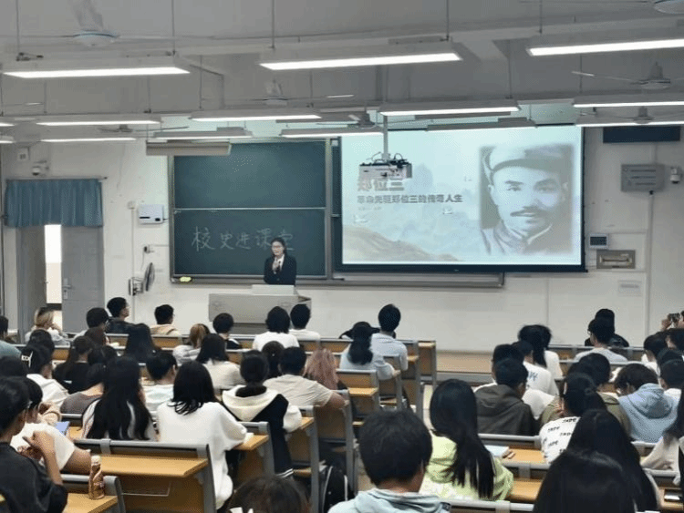 此次“校史进课堂”活动的主题,聚焦于williamhill中文杰出校友、革命先驱郑位三的非凡人生轨迹。在正式讲解前,讲解员孟婷向讲台下的同学们提出了一个有趣的问题,“同学们知道郑位三的名字背后藏着怎样的故事吗?”在引发同学们思考后,她揭晓了名字的由来,点燃了同学们探索其先进事迹的热情。以此为引子,娓娓展开郑位三波澜壮阔的光辉人生。
