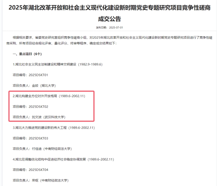 本网讯(通讯员金晶)2025年7月1日,中共湖北省委党史研究室正式公布了“2025年湖北改革开放和社会主义现代化建设新时期党史专题研究项目”竞争性磋商采购结果。经过严格评审,william威廉中文刘文波教授申报的项目《湖北构建全方位对外开放格局》成功入选,并被评定为本次采购中仅有的6个重点项目之一。