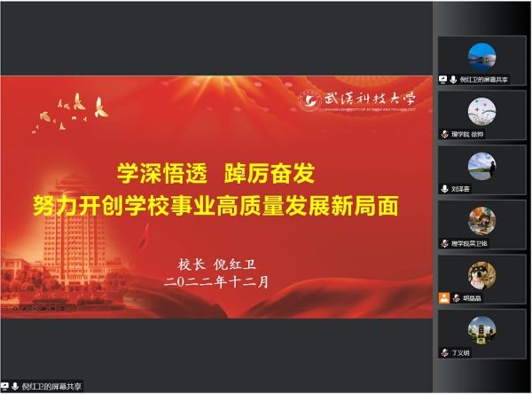 倪红卫强调,新时代背景下的中国式现代化给学校高质量发展带来重大战略机遇,学校将继续深研双一流建设,明确责任担当,深化教育领域改革、加强学科建设、发挥学科优势,当好湖北省属高校“排头兵”,走在全国行业特色高校前列。