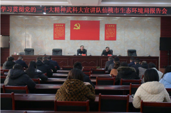 在仙桃市生态环境局,宣讲队成员王黎教授以《推动构建绿色低碳循环发展经济体系政策解读与产业绿色转型》为题,从碳达峰与碳中和的政策背景、实现路径、新技术支撑碳达峰、展望等方面,对党的二十大报告第十部分——推动绿色发展,促进人与自然和谐共生,作了详细解读,为仙桃市推进碳达峰碳中和、加快绿色转型提出了建议。