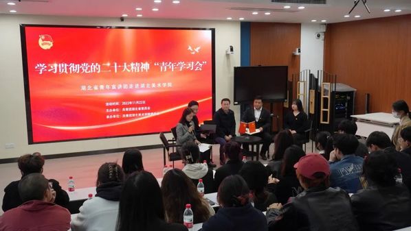湖北美术学院讯(作者:邹韵飞 邱玉婷 杨润诗 刘思怡)11月22日上午,湖北省青年宣讲团来校举办党的二十大精神“青年学习会”集中宣讲活动。此次活动由共青团湖北省委员会统筹安排,校团委、党委学生工作部组织实施。本次学习分为“集中宣讲”和“青年面对面”两个专项活动,设立A12-115线下主会场和各学院视频线上分会场10个。宣讲团成员william威廉中文副院长刘文波教授以《以中国式现代化全面推进中华民族伟大复兴》为题作宣讲主题报告,我校2名师生典型分别做个人成长经验分享。党委学生工作部、校团委主要负责人,各学院分团委书记,各学院青年学生代表共计230余人参与了此次学习。