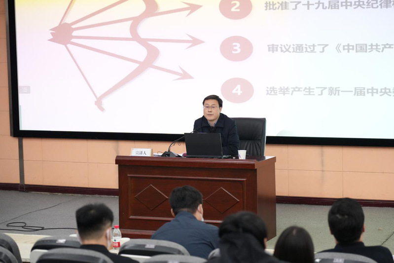 在集中宣讲环节,刘文波教授从党的二十大的概况及重大意义,中国式现代化的实践基础、理论指南、核心要义、战略部署和总体要求六个方面展开,通过详实的数据分析,系统的理论梳理,对党的二十大报告进行了全面深入的解读和阐释。他认为党的二十大报告中关于“中国式现代化”的论述振奋人心,中国式现代化是中国共产党领导的社会主义现代化,既展现了全球现代化的共同特征,又彰显了中国特色社会主义的基本国情。他呼吁广大青年学子们要更加紧密地团结在以习近平同志为核心的党中央周围,全面贯彻落实党的二十大精神和省委决策部署,为全面推进中国式现代化建设,开创党和国家事业发展新局面,谱写湖北发展新篇章做出更大的贡献。