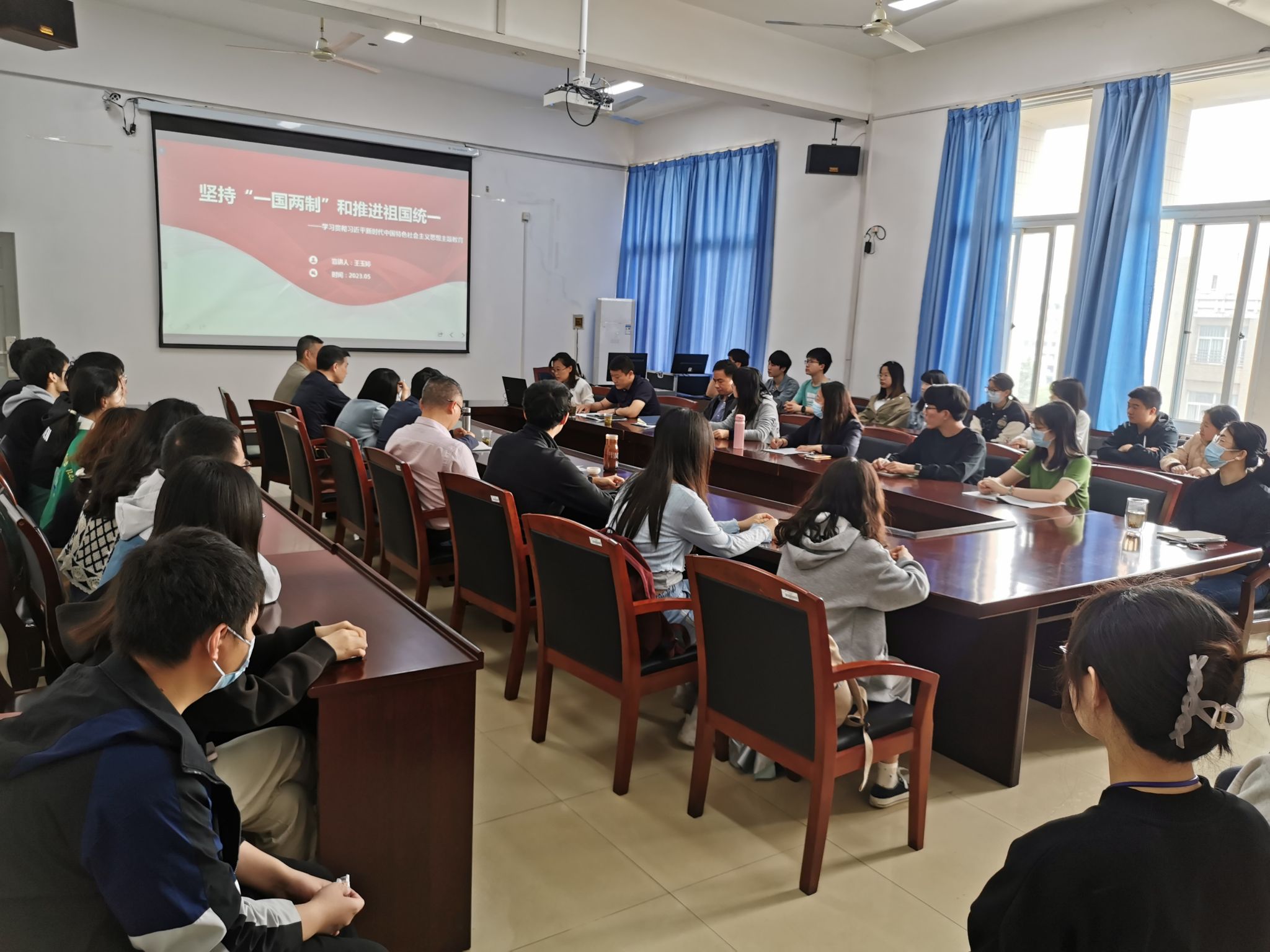 王玉婷以《坚持“一国两制”和推进祖国统一》为主题,聚焦台海问题,结合香港、澳门的成功经验,从“如何坚持‘一国两制’”“为什么说‘一国两制’行得通、办得到、得人心”“为什么说祖国完全统一的时和势始终在我们这一边”等三个方面对我国相关政策、机制、方略、原则进行讲解。她表示,“一国两制”是前无古人的开创性事业,是保持港澳长期繁荣稳定的最佳制度。“和平统一、一国两制”是解决台湾问题的基本方针,实现两岸和平统一,是中华儿女的共同期望,“一个中国”原则是两岸关系的政治基础,是推动两岸关系和平发展的最根本原则。“我们坚决反对任何形式的‘台独’分裂行径。实现国家完全统一是中国共产党矢志不渝的历史任务。在新时代,我国将继续全面准确、坚定不移贯彻‘一国两制’方针。”