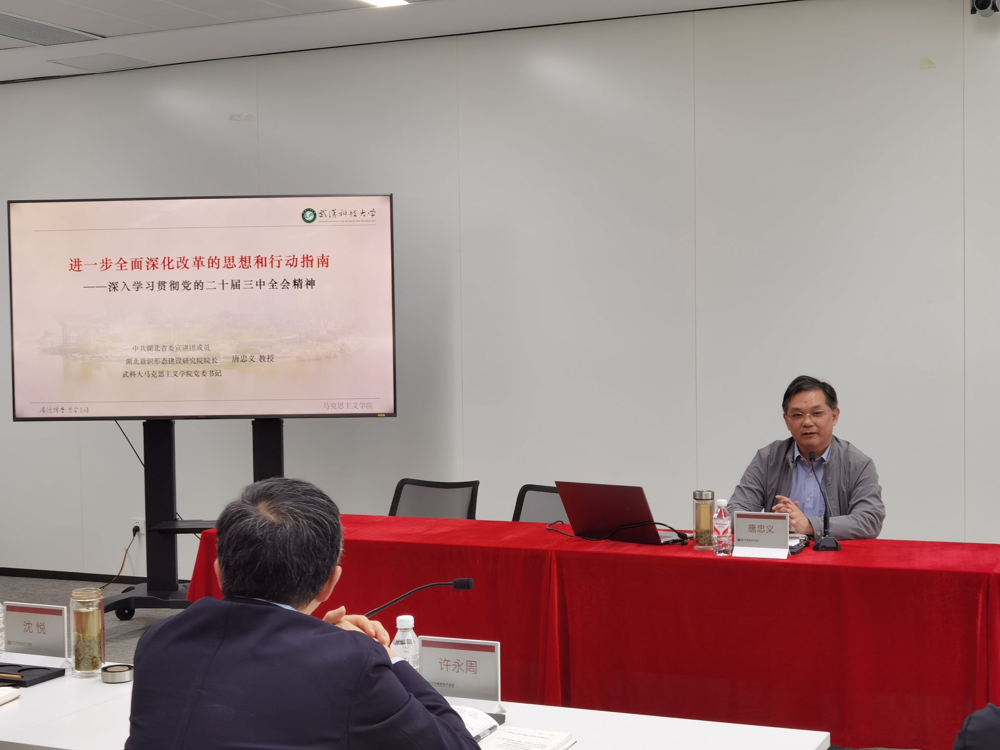 本网讯(通讯员李晓明)为深入学习贯彻党的二十届三中全会精神,全面把握新时代新征程上全面深化改革的重大意义和部署,11月4日,蔡甸经济开发区(奓山街道)举办学习贯彻党的二十届三中全会精神辅导报告暨“强国复兴有我 奋进英雄城市”形势政策报告会。学院党委书记唐忠义教授应邀作专题辅导报告,会议由区委常委、统战部长、蔡甸经济开发区(奓山街道)党工委书记许永周主持。