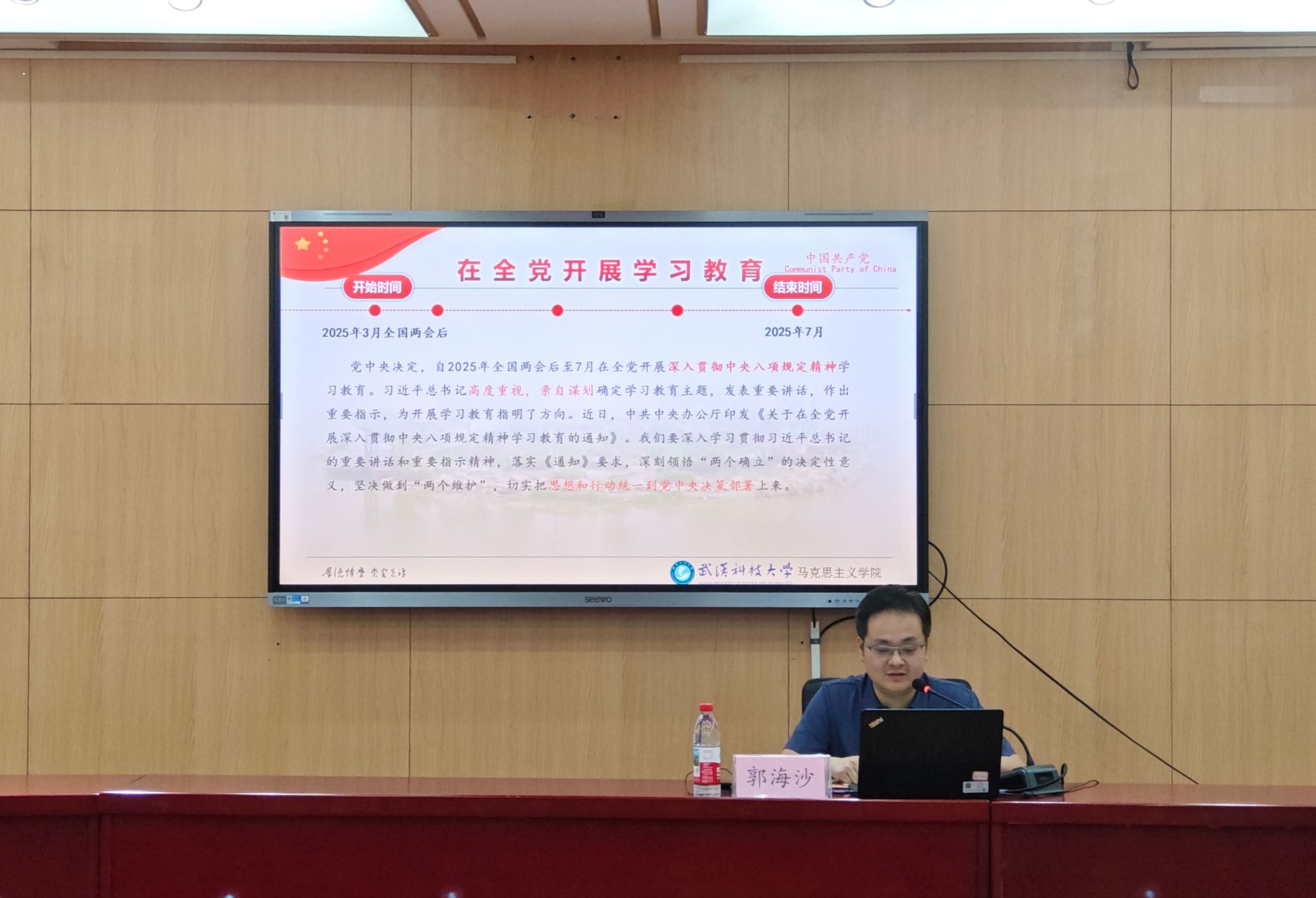 武科大网讯(通讯员周含雪)5月21日晚,学院在41101报告厅开展“深入贯彻中央八项规定精神学习教育暨‘初心如磐,使命在肩’——毕业生党员离校教育”专题活动。学院党委副书记、副院长郭海沙出席会议并讲授专题党课,学院全体学生党员以及本学期发展对象参加活动,活动由辅导员李晓明主持。