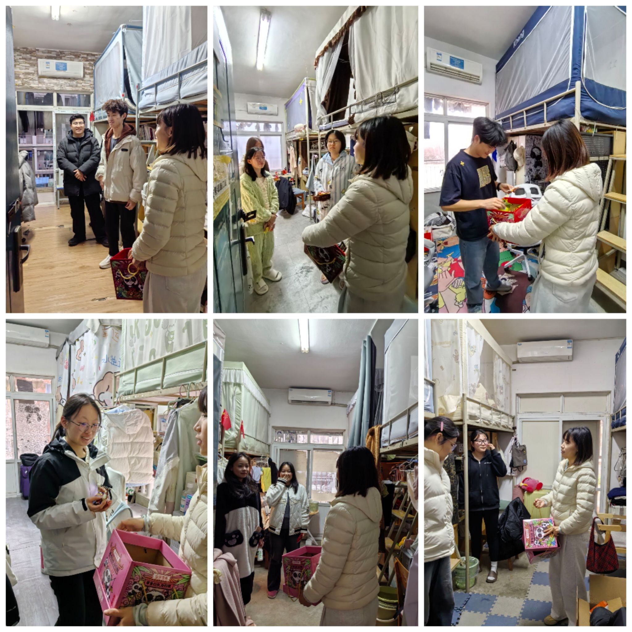 走访过程中,李晓明与学生干部带着学院精心准备的暖贴、文具、零食等慰问品,逐一走进学生宿舍,将温暖亲手送到每一位学生手中。围绕校园安全,李晓明重点强调了四个方面内容。针对冬季天气特点,提醒学生密切关注天气预报,雨雪天气出行注意防滑保暖;针对宿舍消防安全,着重提醒学生严禁使用大功率违规电器,不私拉乱接电线,熟悉宿舍楼消防通道和灭火器材位置,提高火灾防范意识和应急处置能力;结合近期网络诈骗高发案例,告诫学生提高警惕,保护好个人信息和财产安全,切勿轻信陌生信息;临近考试季,着重强调考风考纪,要求同学们诚信应考,杜绝作弊行为,以真实成绩检验学习成果。