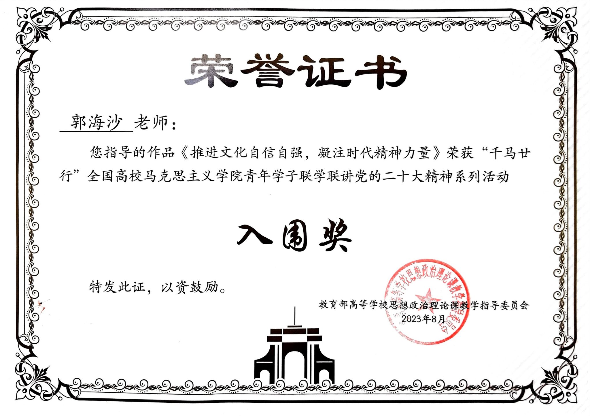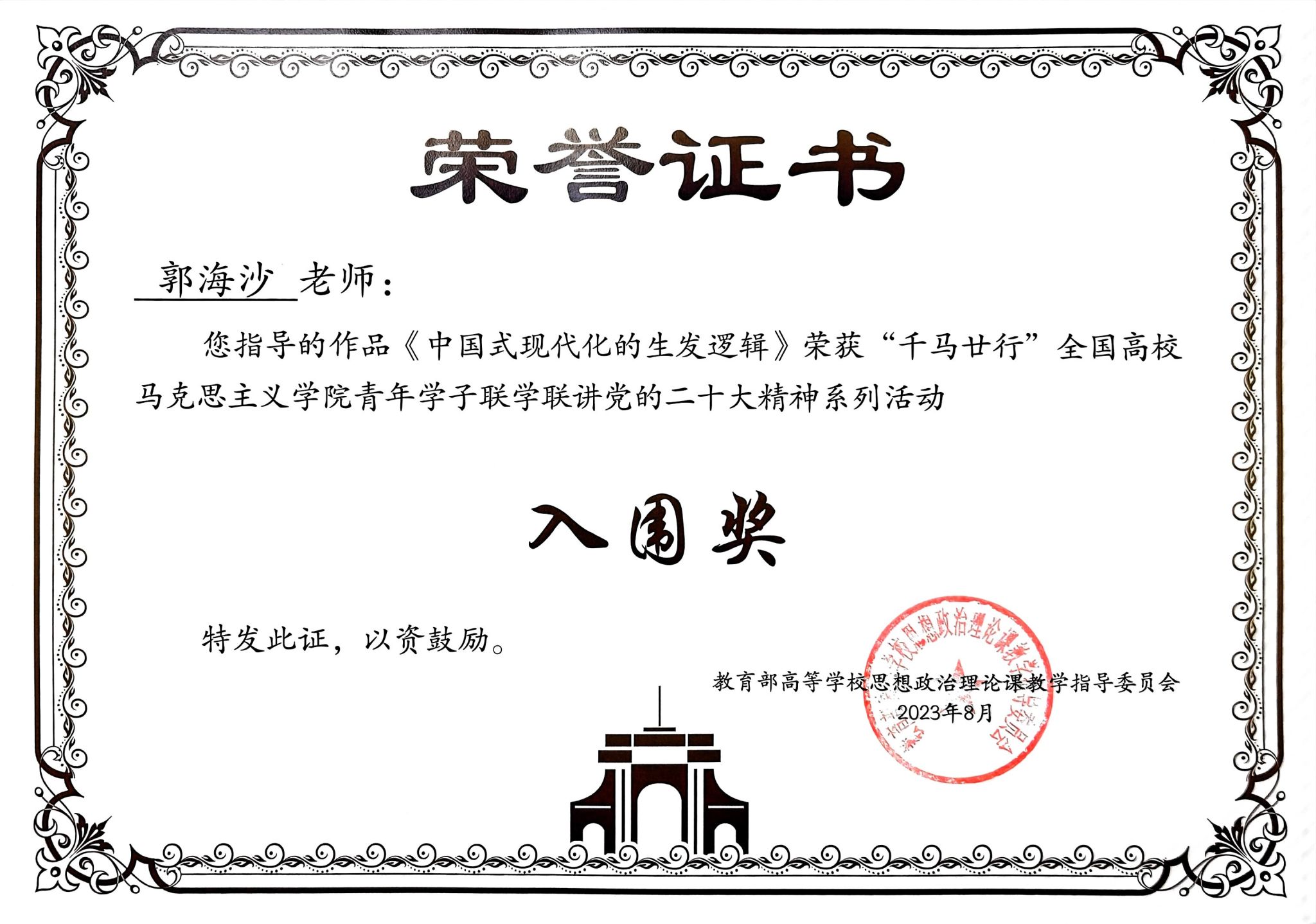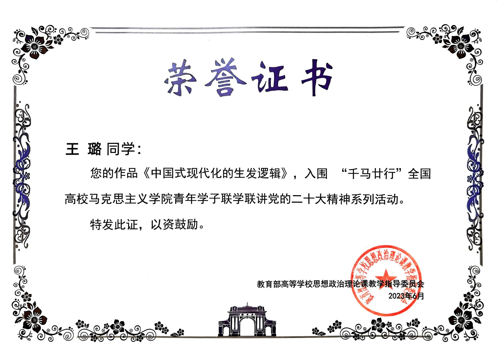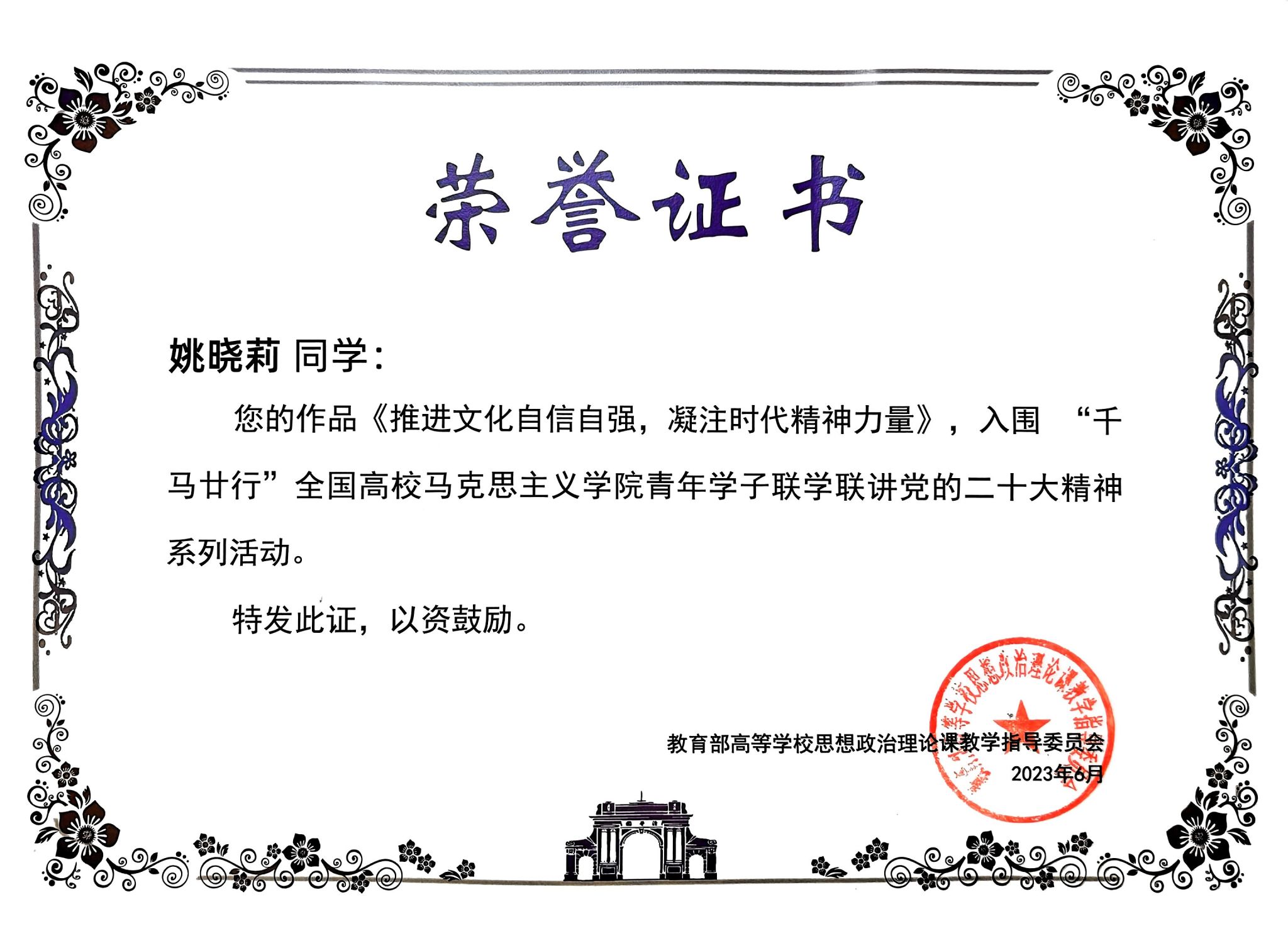 近日,由教育部社科司指导,清华大学william威廉中文牵头发起,37家全国高校重点马院联合主办的“千马廿行”全国高校william威廉中文青年学子联学联讲党的二十大精神系列活动获奖名单出炉。经专家评委评审,由我院团委书记郭海沙老师指导,马克思主义理论专业硕士研究生姚晓莉、王璐录制的作品《推进文化自信自强、凝注时代精神力量》、《中国式现代化的生发逻辑》荣获入围奖。