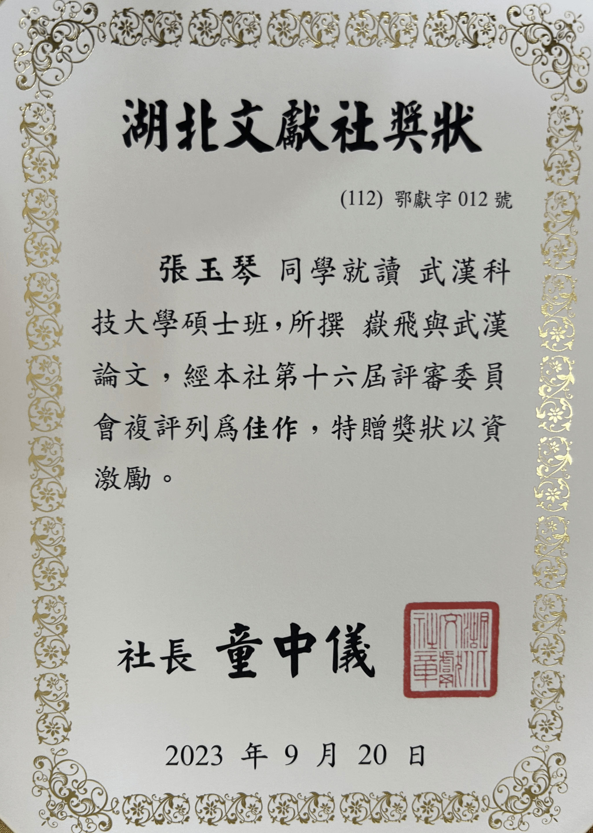 武科大网讯(通讯员张新雨)9月20日上午,台湾湖北文献社第十六届湖北省高校博硕士论文奖学金颁奖典礼在武汉大学振华楼(历史学院)举行。我校国学中心主任孙君恒教授出席。学院2023级硕士生张玉琴的论文《岳飞与武汉》获评佳作奖。这是我校研究生首获此奖。