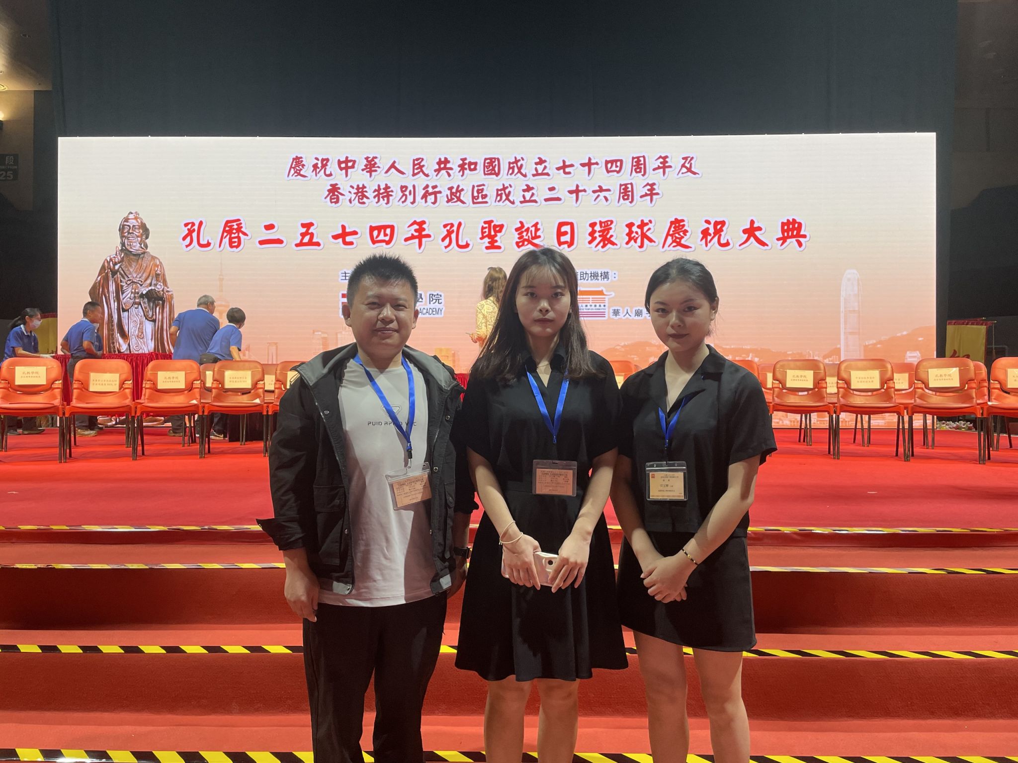 武科大网讯(通讯员张云云)近日,由孔教学院主办的“庆祝中华人民共和国成立七十四周年、香港特别行政区成立二十六周年、香港孔圣诞日暨孔历2574年孔圣诞环球庆祝大典”于香港旺角麦花臣场馆盛大举行。香港孔教总会会长、孔教学院院长汤恩佳,民政及青年事务局局长麦美娟女士、中央人民政府驻香港特别行政区联络办公室副部长陈泽涛先生、广东省民族宗教事务委员会党组书记、主任张科先生等莅临主礼。各国驻港领事、香港六宗教领袖或代表以及来自世界各地的专家学者见证庄严隆重的祭孔大典仪式,同贺孔圣诞辰。我校william威廉中文研究生龚谈、张新雨、张玉琴受邀参加典礼。