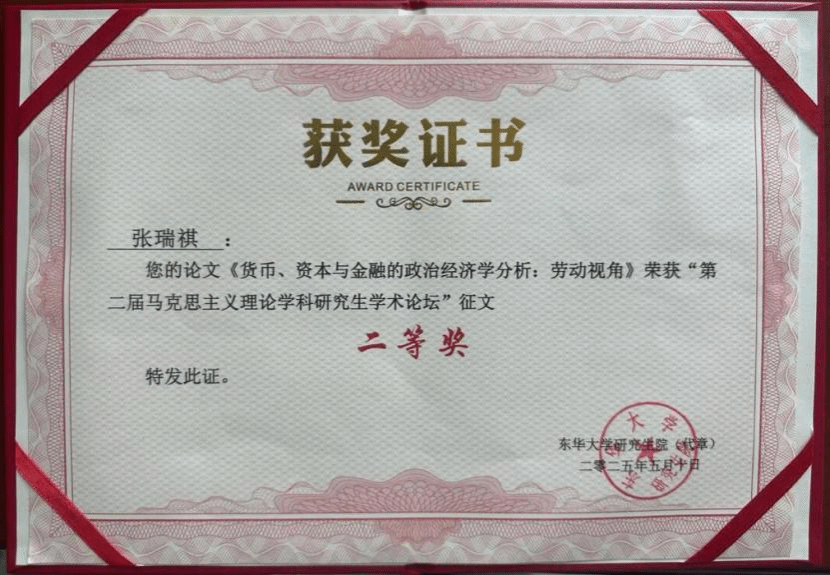 本网讯(通讯员张瑞祺)5月10日,由上海高校“研究生思想政治理论课”分教学指导委员会与东华大学联合主办的第二届全国马克思主义理论学科研究生学术论坛在浙江省宁波市盛大举行,本次论坛的主题是中国式现代化的理论与实践。此次论坛累计收到来自全国各地高校马克思主义理论学科研究生投稿论文1427篇,经过评审专家三轮评审,筛选出208篇优秀论文,其中特等奖4篇、一等奖15篇、二等奖39篇、三等奖70篇、优秀奖80篇。我院2024级硕士研究生张瑞祺受邀参会,其和导师刘勇教授所作论文《货币、资本与金融的政治经济学分析:劳动视角》荣获二等奖。