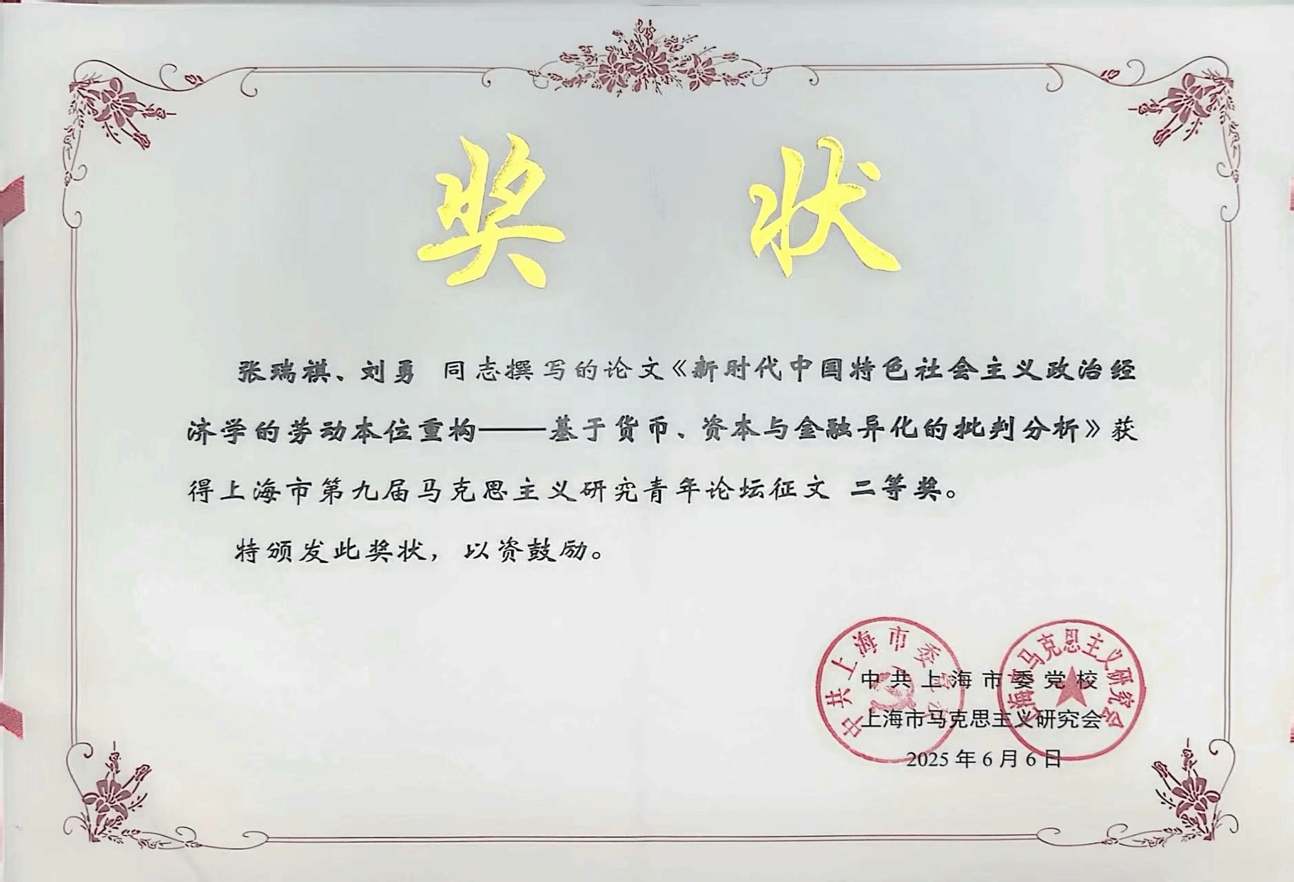 论坛共收到来自全国高校马克思主义理论学科师生投稿论文452篇。经专家多轮评审,最终评选出优秀论文42篇,包括一等奖5篇、二等奖10篇、三等奖27篇。我院2024级硕士研究生张瑞祺受邀参会,其和导师刘勇教授所作论文“新时代中国特色社会主义政治经济学的劳动本位重构——基于货币、资本与金融异化的批判分析”荣获二等奖。