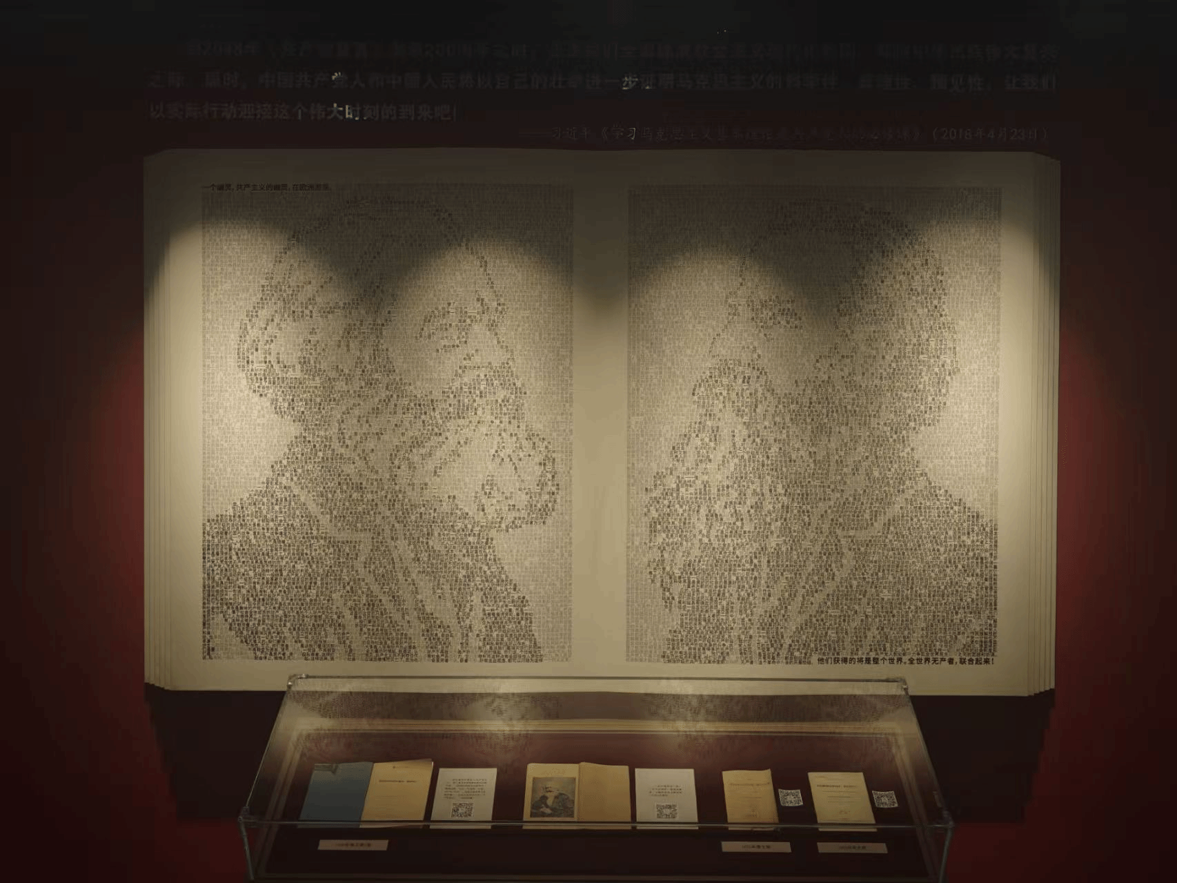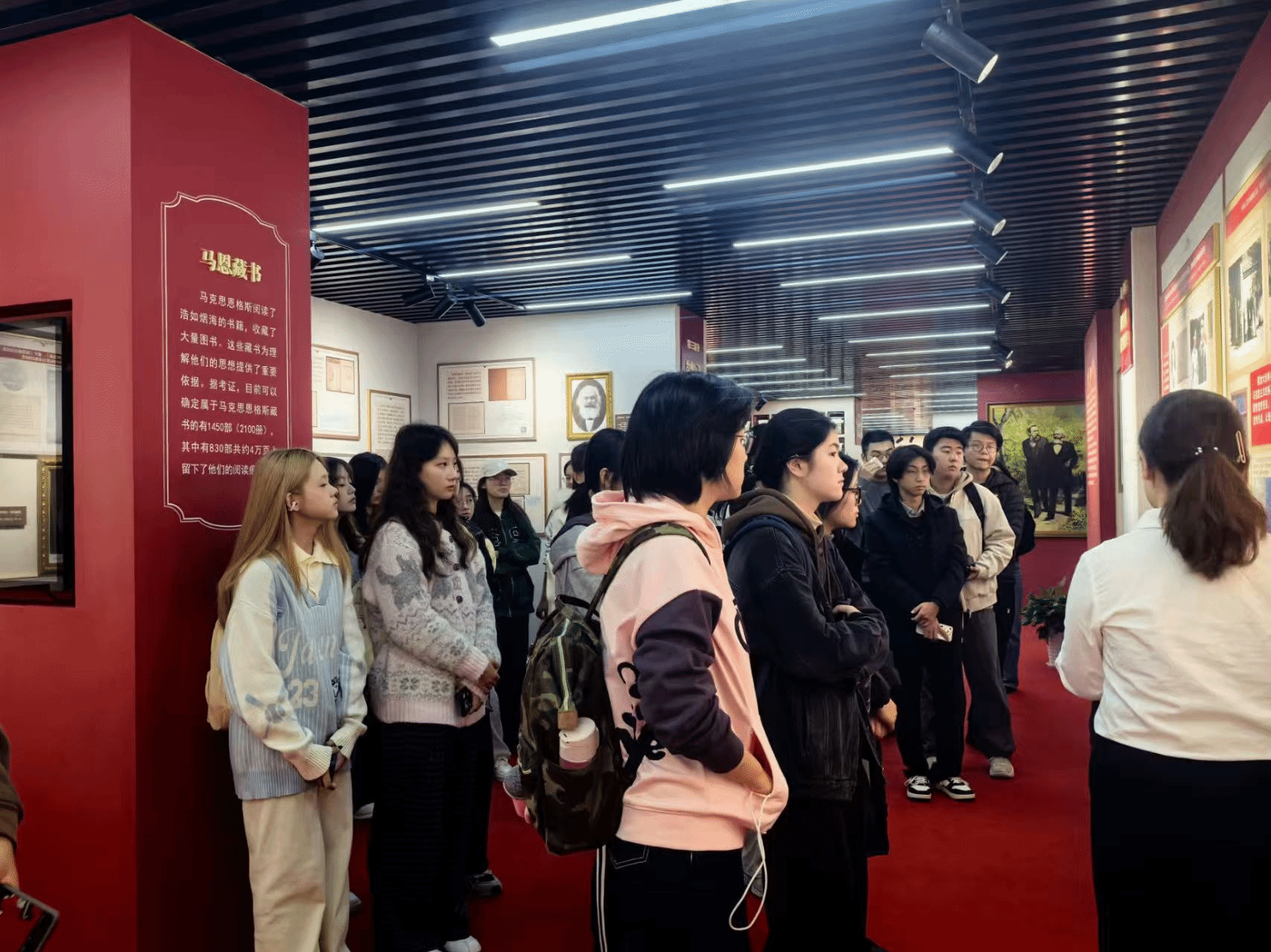 在讲解员的引导下,同学们有序参观,认真学习,一睹文献珍品“真容”之余,还通过手稿、藏书等,追寻马克思恩格斯的思想轨迹、感知他们的伟大人格。展览还打造一面由《共产党宣言》文字组成的马克思恩格斯画像,颇具视觉冲击,寓意马克思主义深刻改变了人类的历史进程,同学们纷纷拍照留念。