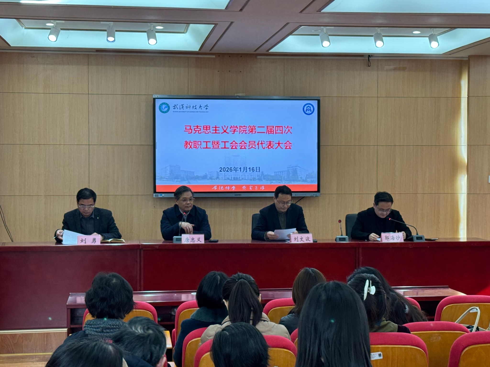 刘文波代为作学院2025年科研工作报告,内容涵盖学科建设提质、国家社科基金及教育部人文社科项目立项突破、博士点培育攻坚、高水平学术论文产出、学术交流平台搭建等关键工作,系统总结了学院在科研创新与学科发展上的进展与突破;副院长刘勇向大会作学院2025年教学工作报告,聚焦“大思政课”建设、一流课程培育、教学成果获奖、教研项目推进、课程体系优化及教学实践活动开展等核心领域,进行了详实具体的梳理与汇报,清晰呈现了全年教育教学工作的推进脉络与亮点成果;党委副书记、副院长、院工会主席郭海沙向大会作学院2025年工会工作报告,从坚持思想引领、健全体制机制、深化民主管理、履行工会职能、打造品牌阵地、抓实队伍建设、彰显工作成效七个维度,全面阐述了工会围绕学院中心工作、凝聚师生合力、服务师生需求所付出的扎实努力与取得的显著成效。