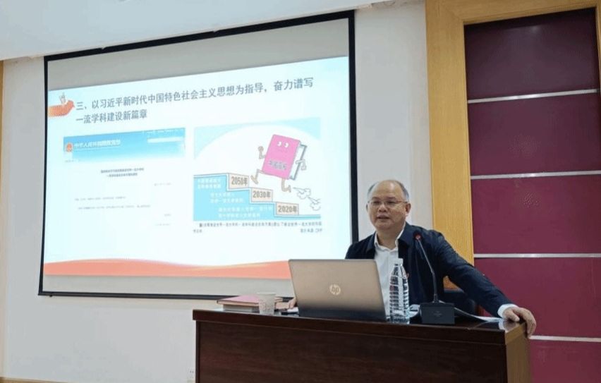 5月19日,学校党委常委、组织部部长刘时新以《坚持以习近平新时代中国特色社会主义思想为指引 坚定不移推动高质量发展》为题,为体育学院师生讲授思政课。刘时新围绕准确把握习近平新时代中国特色社会主义思想的主要内容、理论品质、方式方法、体育篇章,做到以学铸魂、以学增智、以学正风、以学促干等方面进行展开。刘时新表示,习近平新时代中国特色社会主义思想是马克思主义中国化最新成果,科学回答了“中国向何处去、世界向何处去”的时代之问,要全面学习掌握“十个明确”“十四个坚持”“十三个方面成就”等主要内容,整体把握这一思想的科学体系;要往深里学、往心里学、往实里学,从中品悟真理的味道、感悟思想的伟力,增强旗帜鲜明讲政治的政治自觉、思想自觉、行动自觉。