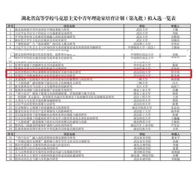 本网讯(通讯员郭海沙)近日,湖北省教育厅公布了2022年度省社科基金前期资助项目评审结果,我院哲学系管开明副教授、思想政治教育系陈喜林副教授入选湖北省高等学校马克思主义中青年理论家培育计划(第九批)。