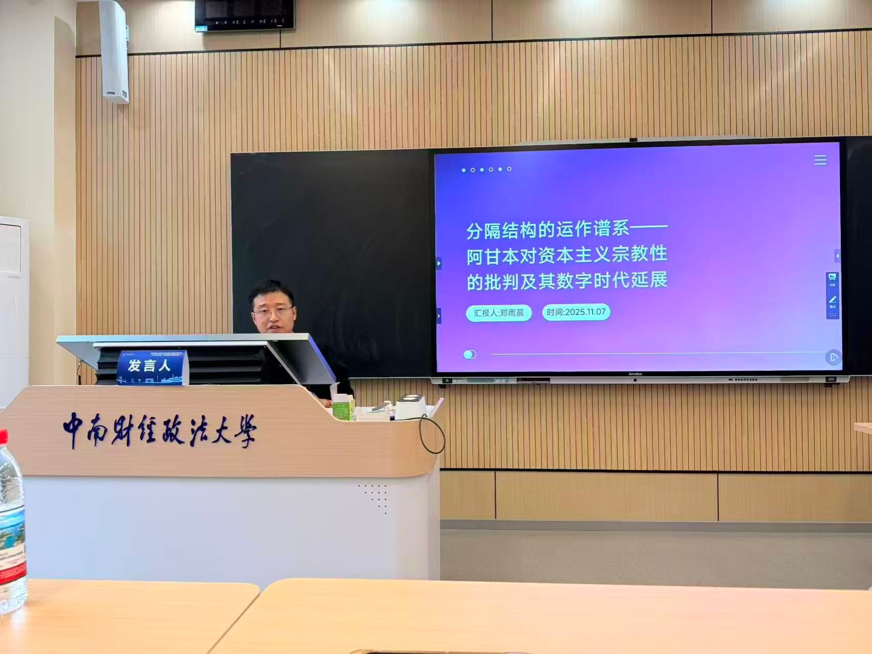 在专题研讨环节,郑雨晨以《分隔结构的运作谱系——阿甘本对资本主义宗教性的批判及其数字时代延展》 为题作了学术报告。该报告从意大利左翼哲学家吉奥乔·阿甘本的对宗教分隔结构的分析出发,呈现了该结构在资本主义政治与经济层面的运作逻辑,并创造性地将其延展至当下的数字时代语境。